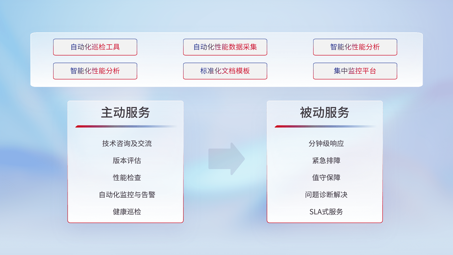 智能化工具和标准化文档,,,,保障服务质量,,,提供主动服务(包含技术咨询、、、版本评估、、性能检查、、、、自动化监控与告警、、、、健康巡检)和被动服务包含(分钟级响应、、紧急排障、、值守保障、、、问题诊断解决、、SLA服务)。。